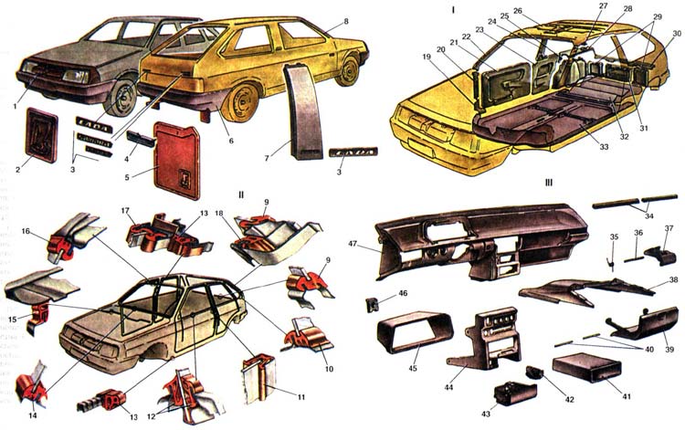1. Решетка радиатора; 2. Заводской знак; 3. Орнаменты задка и центральной стойки; 4. Планка крепления фартука; 5. Фартук заднего колеса; 6. Задний бампер; 7. Облицовка центральной стойки автомобиля ВАЗ-2108; 8. Окантовка сточного желобка крыши; 9. Уплотнитель стекла двери задка; 10. Уплотнитель стекла боковины; 11. Уплотнитель направляющего желобка опускного стекла; 12. Нижние уплотнители опускного стекла; 13. Уплотнитель проема передней двери; 14. Нижний уплотнитель ветрового стекла; 15. Уплотнитель коробки воздухопритока; 16. Верхний уплотнитель ветрового стекла; 17. Уплотнитель желобка опускного стекла; 18. Уплотнитель проема двери задка: 19. Передняя нижняя обивка боковины; 20. Передняя верхняя обивка боковины; 21. Обивка передней двери; 22. Обивка стойки ветрового окна; 23. Средняя обивка боковины; 24. Обивка центральной стойки; 25. Обивка арки заднего колеса; 26. Обивка крыши; 27. Обивка задней стойки; 28. Опора полки багажного отделения; 29. Правая и левая обивки задка; 30. Облицовка поперечины задка; 31. Средняя обивка задка; 32. Коврик багажного отделения; 33. Коврик пола; 34. Уплотнитель панели приборов; 35. Пружина замка вещевого ящика; 36. Ось замка вещевого ящика; 37. Замок вещевого ящика; 38. Корпус вещевого ящика; 39. Крышка вещевого ящика; 40. Оси петель крышки; 41. Коробка для мелких вещей; 42. Направляющая пепельницы; 43. Передняя пепельница: 44. Накладка консоли панели приборов; 45. Козырек; 46. Скоба для винтов крепления; 47. Панель приборов; 48. I.Внутренняя отделка кузова; 49. II.Резиновые уплотнители; 50. Панель приборов.