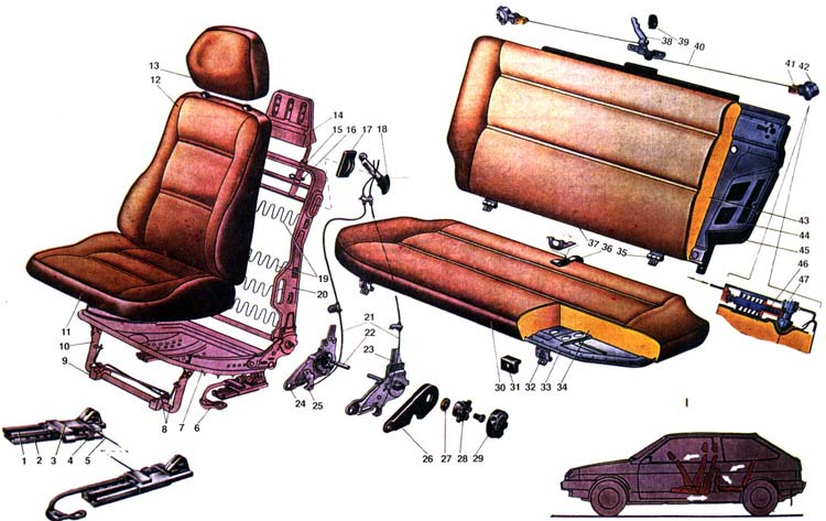 1. Направляющая салазок; 2. Фиксатор механизма передвижения внутренних салазок; 3. Ползун; 4. Защелка внутренних салазок; 5. Тяга защелок; 6. Ручка механизма передвижения; 7. Основание подушки; 8. Торсионы; 9. Передний кронштейн; 10. Стойка основания; 11. Подушка переднего сиденья; 12. Спинка переднего сиденья; 13. Подголовник; 14. Каркас подголовника; 15. Направляющая подголовника; 16. Шплинт; 17. Облицовка рычага откидывания спинки; 18. Ручка механизма откидывания спинки; 19. Пружины основания спинки; 20. Основание спинки; 21. Тяги механизма откидывания спинки; 22. Синхронизатор; 23. Верхнее звено регулирования наклона спинки; 24. Нижнее звено регулирования наклона спинки; 25. Крючок; 26. Облицовка механизма регулирования наклона спинки; 27. Прокладка; 28. Держатель ручки: 29. Ручка механизма регулирования наклона спинки; 30. Подушка заднего сиденья; 31. Облицовка петли подушки; 32. Петля подушки; 33. Основание подушки; 34. Набивка подушки; 35. Петля спинки; 36. Привод замка подушки; 37. Спинка заднего сиденья; 38. Рычаг привода замка спинки; 39. Рукоятка привода замка спинки; 40. Тяга замка; 41. Держатель тяги; 42. Замок спинки; 43. Набивка спинки; 44. Основание спинки; 45. Панель спинки; 46. Язык замка; 47. Фиксатор замка; 48. I.Схема изменения положений подушки и спинки сидений.