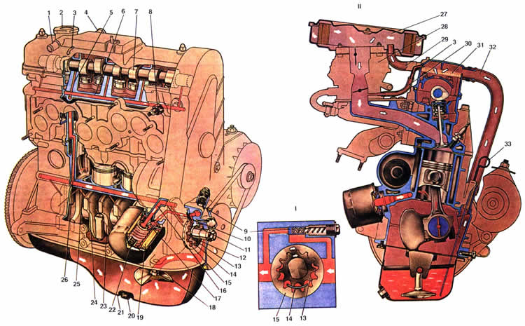 1. Патрубок отвода партерных газов в корпус воздушного фильтра; 2. Крышка маслоналивной горловины; 3. Патрубок отсоса картерных газов в задроссельное пространство карбюратора: 4. Патрубок вытяжного шланга; 5. Канал подачи масла к подшипникам распределительного вала; 6. Масляная магистраль в головке цилиндров: 7. Распределительный вал; 8. Датчик указателя давления масла; 9. Редукционный клапан насоса; 10. Канал подачи масла от насоса к фильтру; 11. Передний сальник коленчатого вала; 12. Канал поступления масла от маслоприемника к насосу; 13. Ведущая шестерня масляного насоса; 14. Серпообразный выступ между шестернями; 15. Ведомая шестерня масляного насоса; 16. Канал подачи масла из фильтра в главную масляную магистраль: 17. Противодренажный клапан; 18. Маслоприемник; 19. Картонный фильтрующий элемент; 20. Сливная пробка; 21. Масляный картер: 22. Перепускной клапан; 23. Канал подачи масла от коренного подшипника к шатунному: 24. Канал подачи масла к коренному подшипнику коленчатого вала; 25. Главная масляная магистраль; 26. Канал подачи масла в масляную магистраль головки блока; 27. Воздушный фильтр; 28. Карбюратор; 29. Шланг отвода картерных газов в корпус воздушного фильтра; 30. Шланг отвода карьерных газов в задроссельное пространство карбюраюра; 31. Сетка маслоотделителя; 32. Вытяжной шланг картерных газов: 33. Указатель уровня масла; 34. I.Схема работы масляного насоса; 35. II.Схема вентиляции картера двигателя.